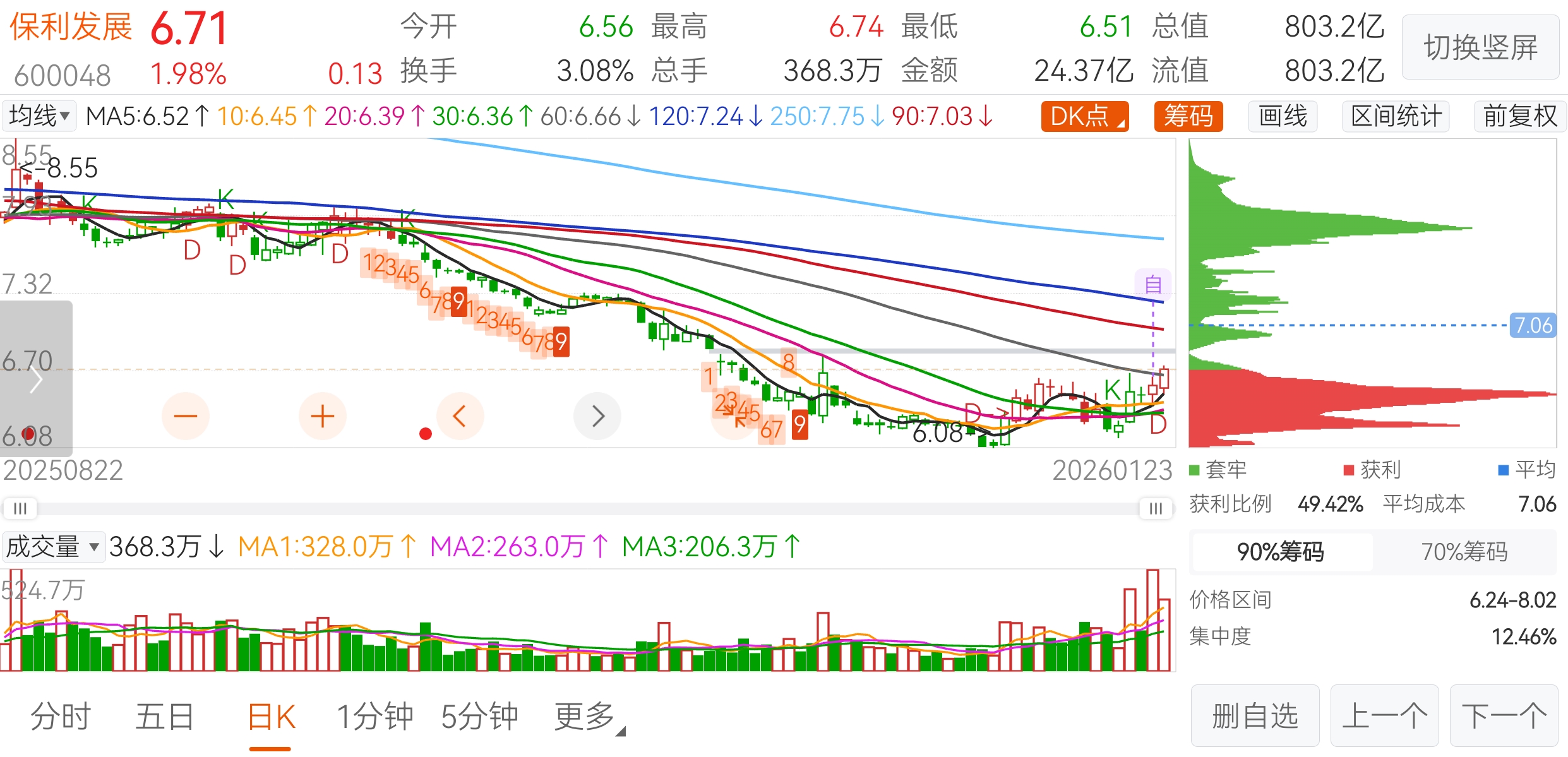 筹码峰下移,说明有人割肉或做T了。从这里到7.5是筹码稀疏区,抛盘不大,所以步子能够迈大点,就看是否愿意上。但估计会提前引诱8元附近的筹码下来,而不是直接上去解放。要是主动帮解套,那目标位肯定在10元之上。$保利发展(SH600048)$