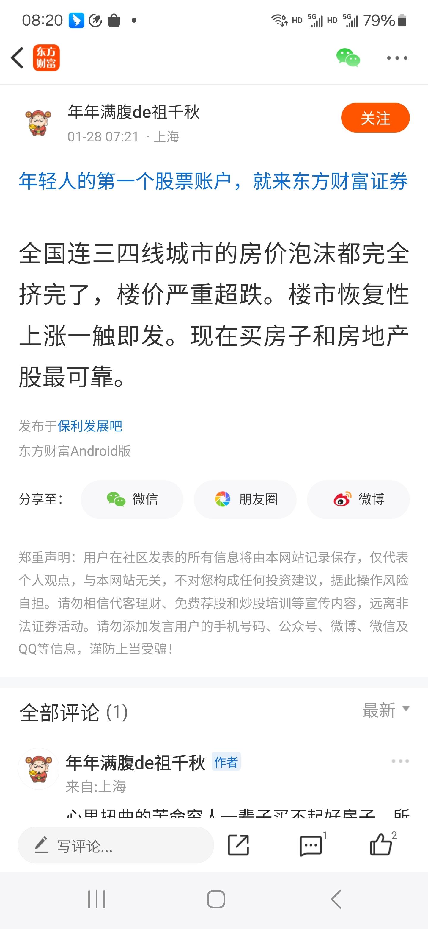 温馨提示: 1.根据《证券法》规定,禁止编造、传播虚假信息或者误导性信息,扰乱证券市场;2.用户在本社区发表的所有资料、言论等仅代表个人观点,与本网站立场无关,不对您构成任何投资建议。用户应基于自己的独立判断,自行决定证券投资并承担相应风险。《东方财富社区管理规定》