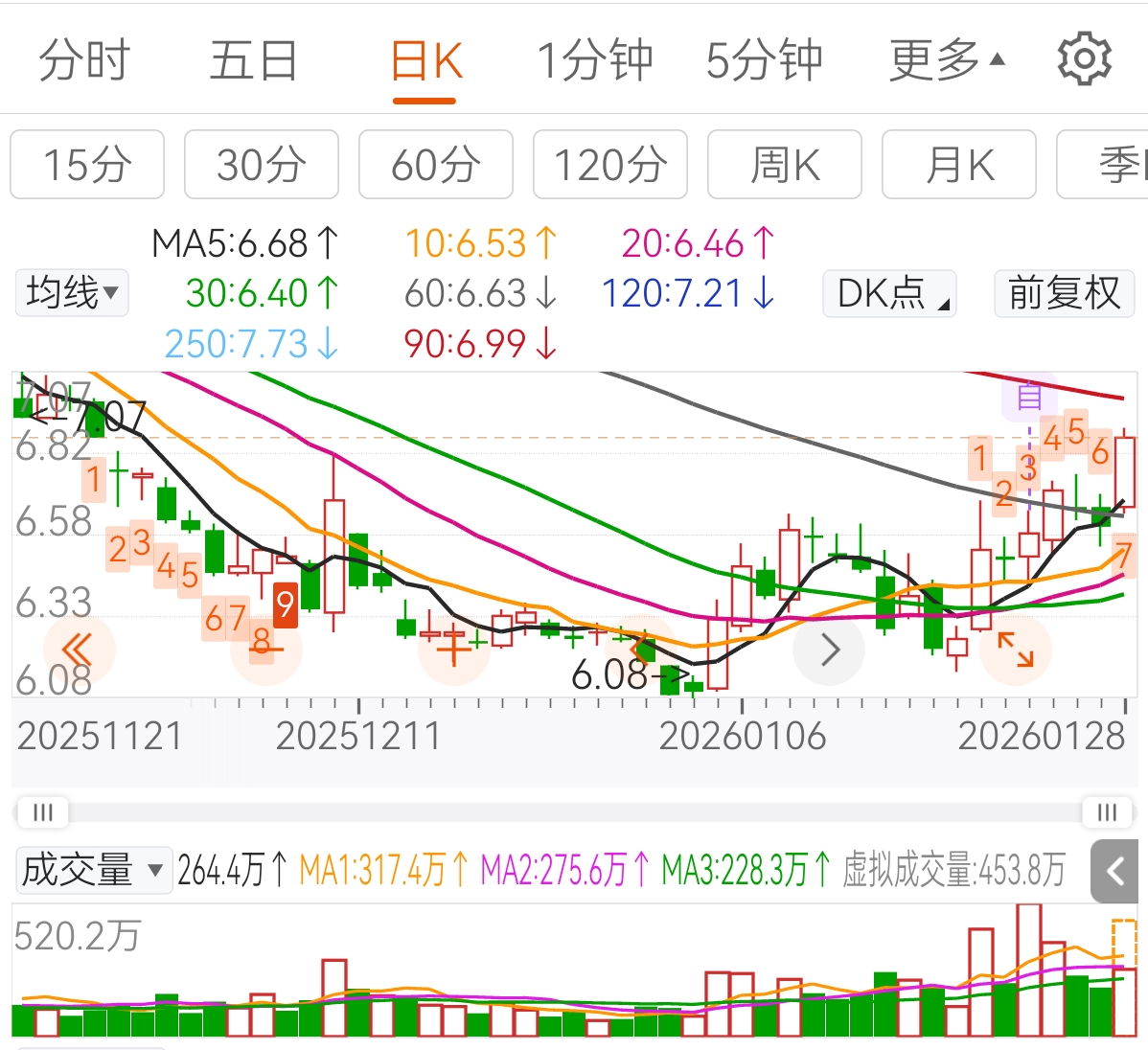 缺口已补,下一目标位:7元。上周那几天的量能,相对于前面那根大阳线的量,就能得知