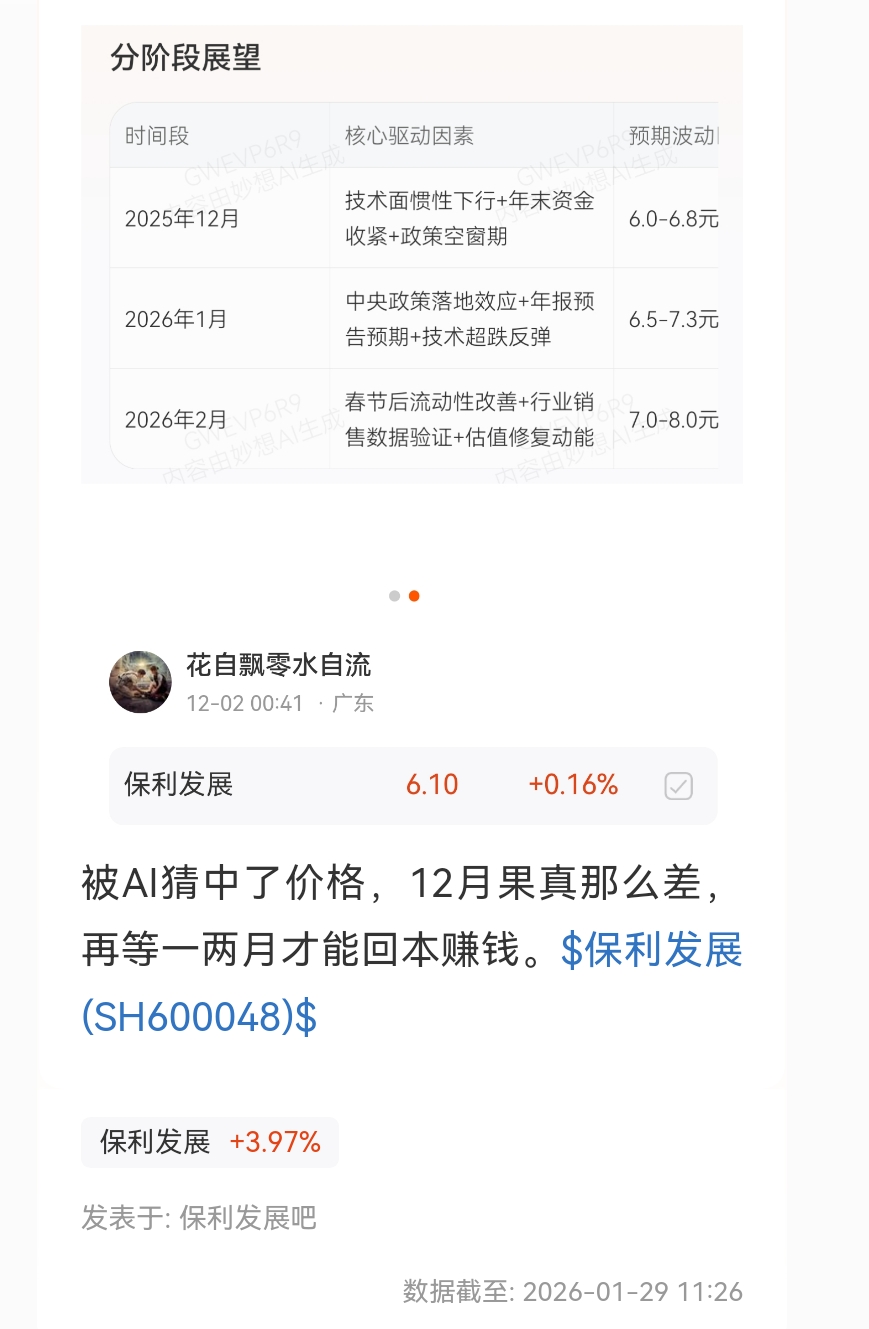 被AI猜中了价格,12月果真那么差,再等一两月才能回本赚钱。$保利发展(SH600048)$