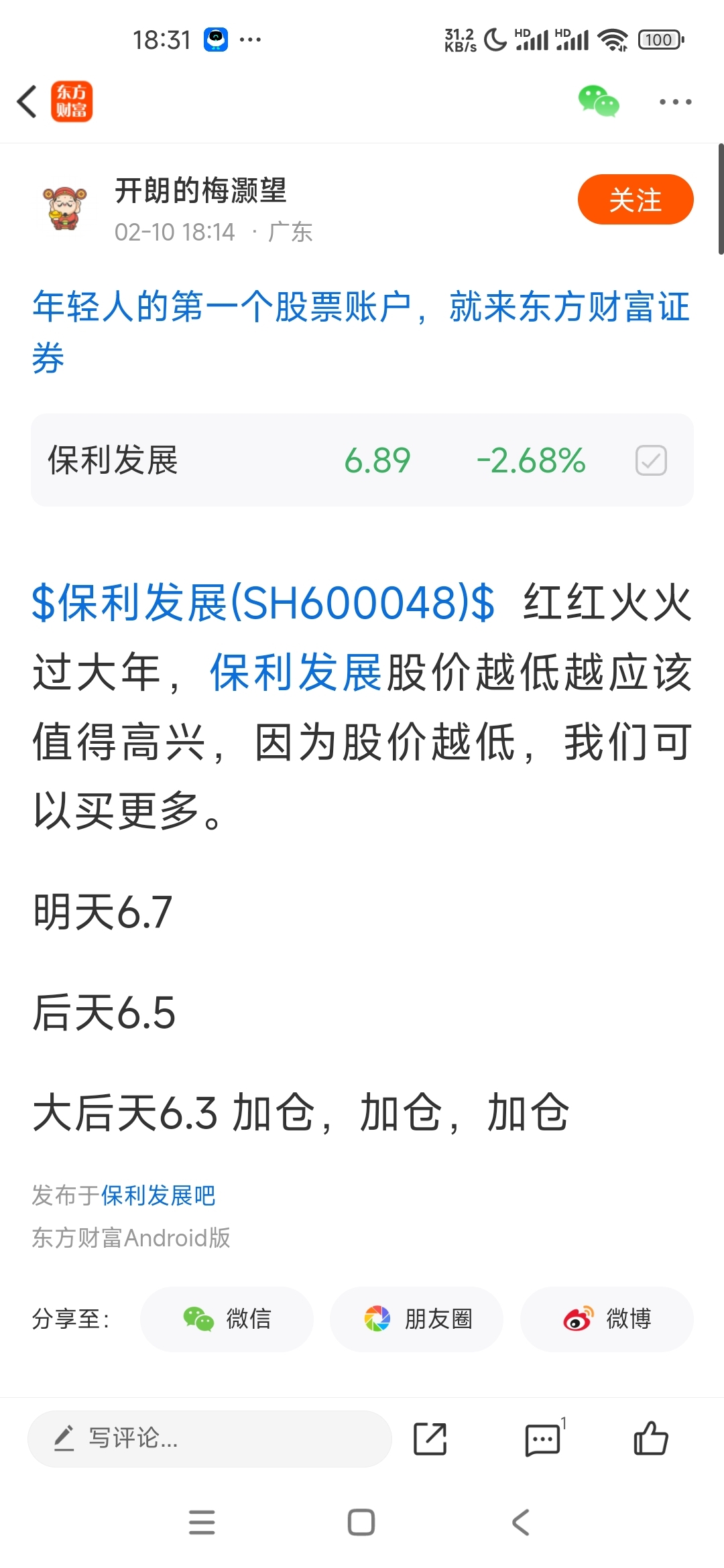 $保利发展(SH600048)$ 支持楼主,保利发展股价越低越好,因为股价越低,我们就可以买更多,为保利的下跌感到开心快乐,再下一天5.8,再下一天4.6,再下一天,3.6,加仓,加仓,加仓