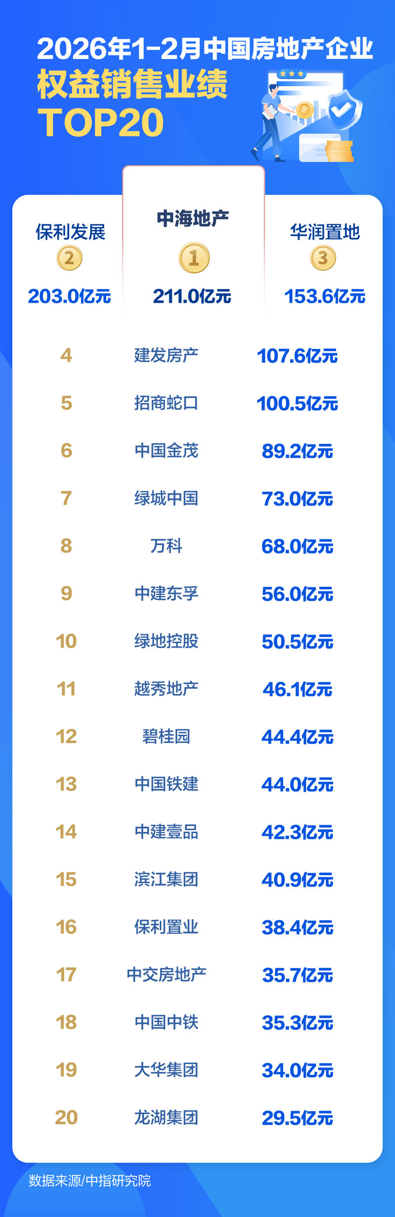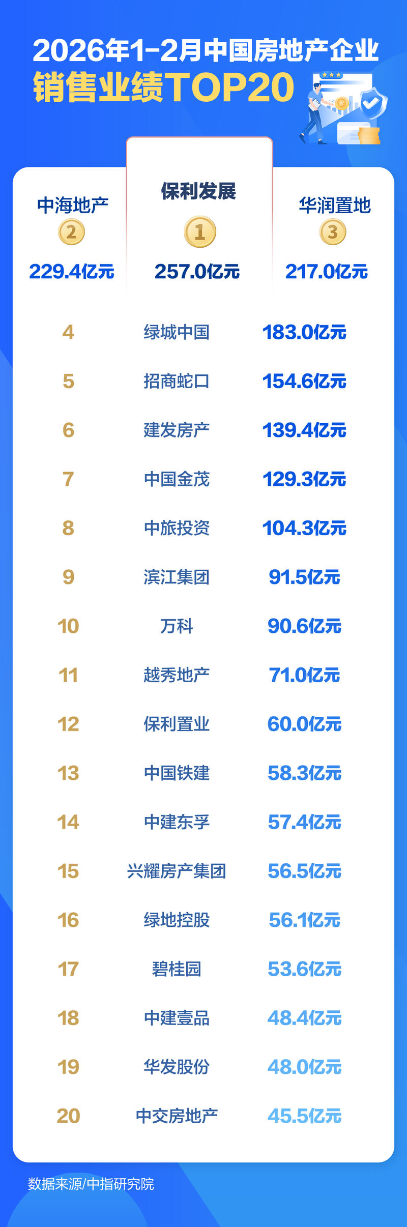 根据中指研究院发布的2026年1—2月百强房企销售榜单(全口径销售额),保利发展、中海地产、华润置地位居前三名,销售额分别是257亿元、229.4亿元和217亿元。