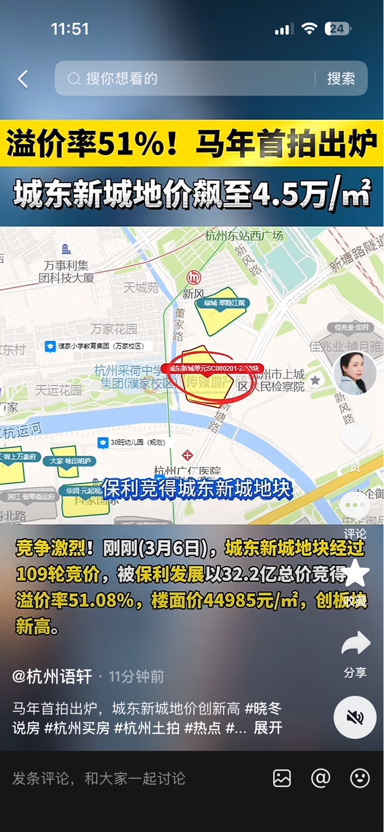 $保利发展(SH600048)$ 保利杭州京杭大运河边拿地了,城东板块楼面价新高,附近开发过保利中央公馆