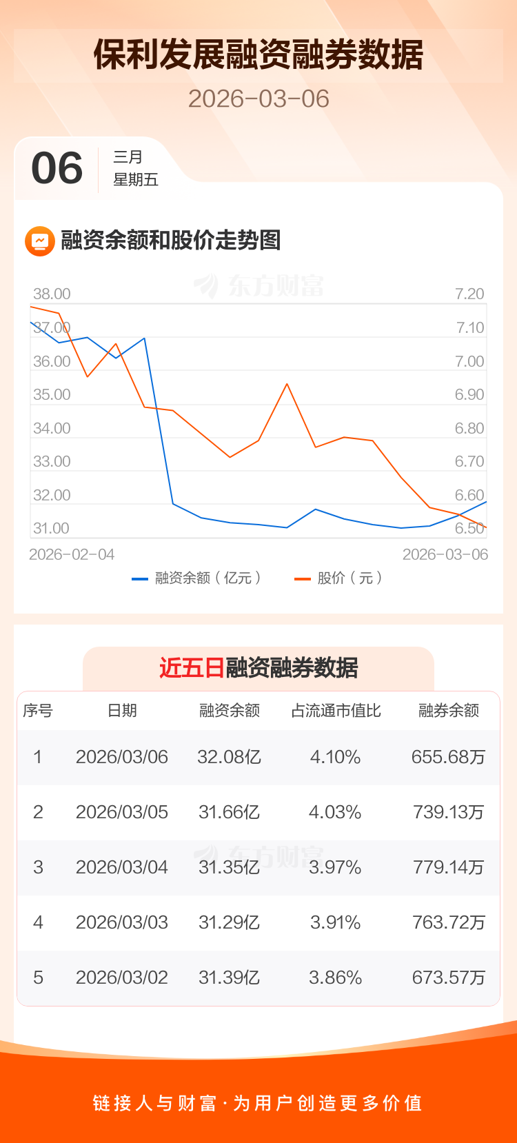 交易所最新数据显示,保利发展于2026年3月6日获融资买入1.47亿元,融资偿还1.04亿元,当日融资净买入4238.19万元。目前,该股融资余额32.08亿,占流通市值比例为4.10%。