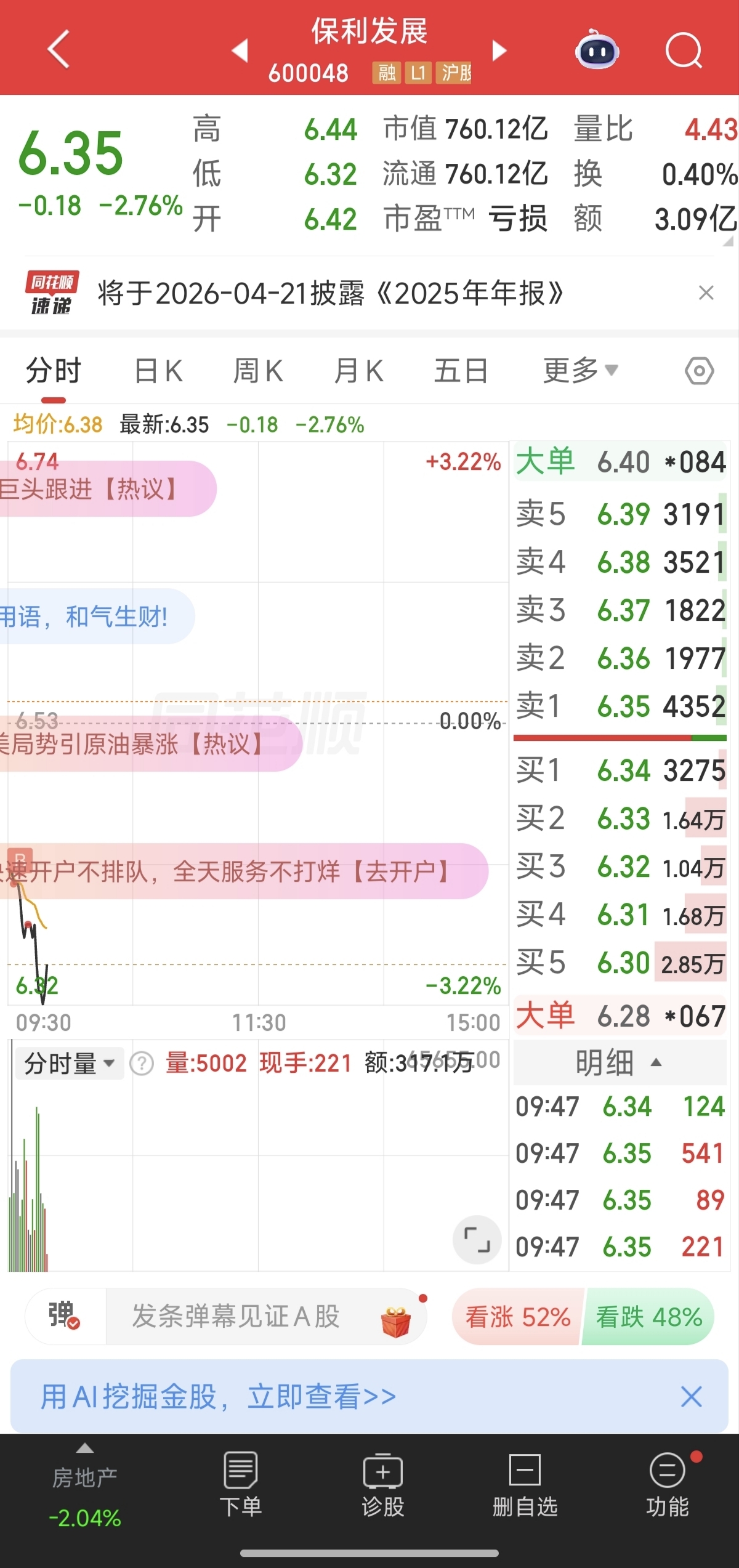 $保利发展(SH600048)$ 加仓保利发展!今天开盘卖了金龙鱼,拍断大腿