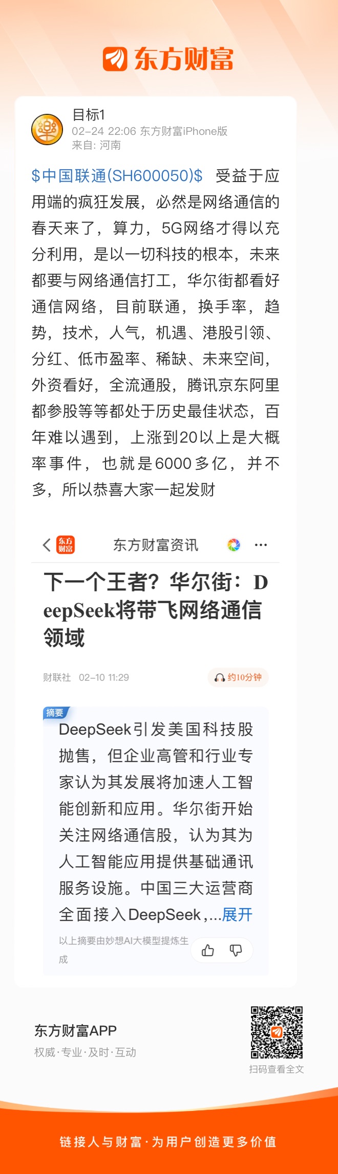 $中国联通(SH600050)$ 受益于应用端的疯狂发展,必然是网络通信的春天来了,算力,5G网络才得以充分利用,是以一切科技的根本,未来都要与网络通信打工,华尔街都看好通信网络,目前联通,换手率,趋势,技术,人气,机遇、港股引领、分红、低市盈率、稀缺、未来空间,外资看好,全流通股,腾讯京东阿里都参股等等都处于历史最佳状态,百年难以遇到,上涨到20以上是大概率事件,也就是6000多亿,并不多,所以恭喜大家一起发财
