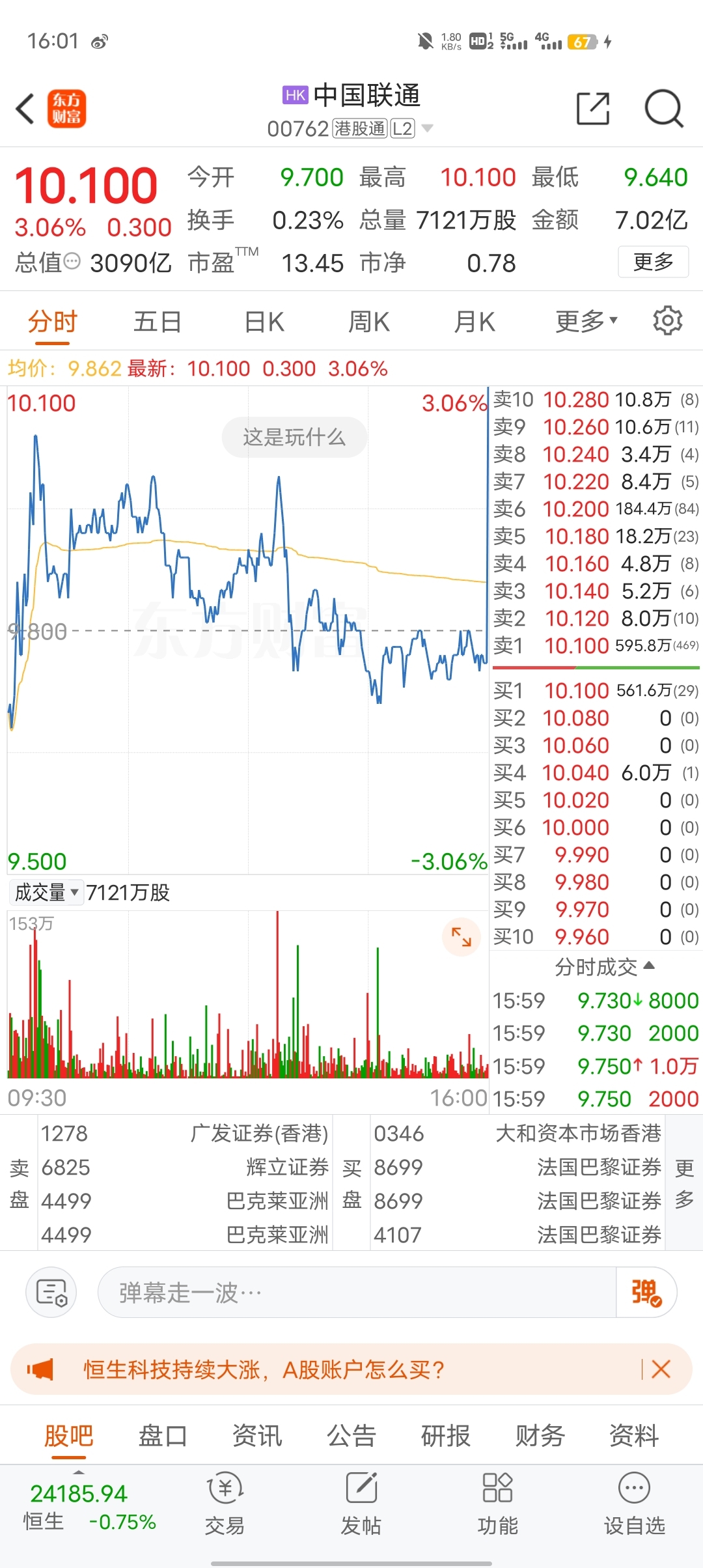 兄弟们,港股中国联通尾盘这个大长腿是啥意思