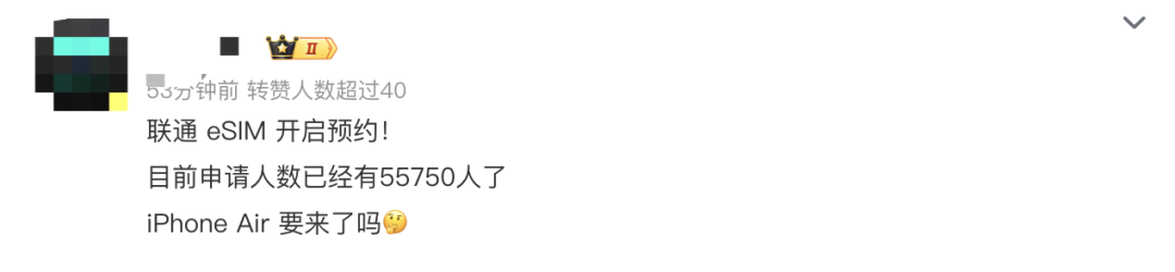 有网友表示:联通eSIM开始预约了,是不是意味着iPhone Air国行也快来了?