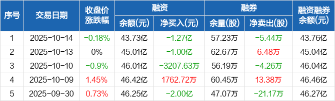 融资方面,当日融资买入2.13亿元,融资偿还3.4亿元,融资净偿还1.27亿元,连续3日净偿还累计2.6亿元。融券方面,融券卖出15.69万股,融券偿还21.13万股,融券余量57.23万股,融券余额315.91万元。融资融券余额合计43.76亿元。