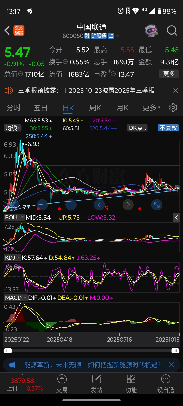 $中国联通(SH600050)$ K线形态支持上涨!实际走势低于预期……股市里有时就是出乎意外……