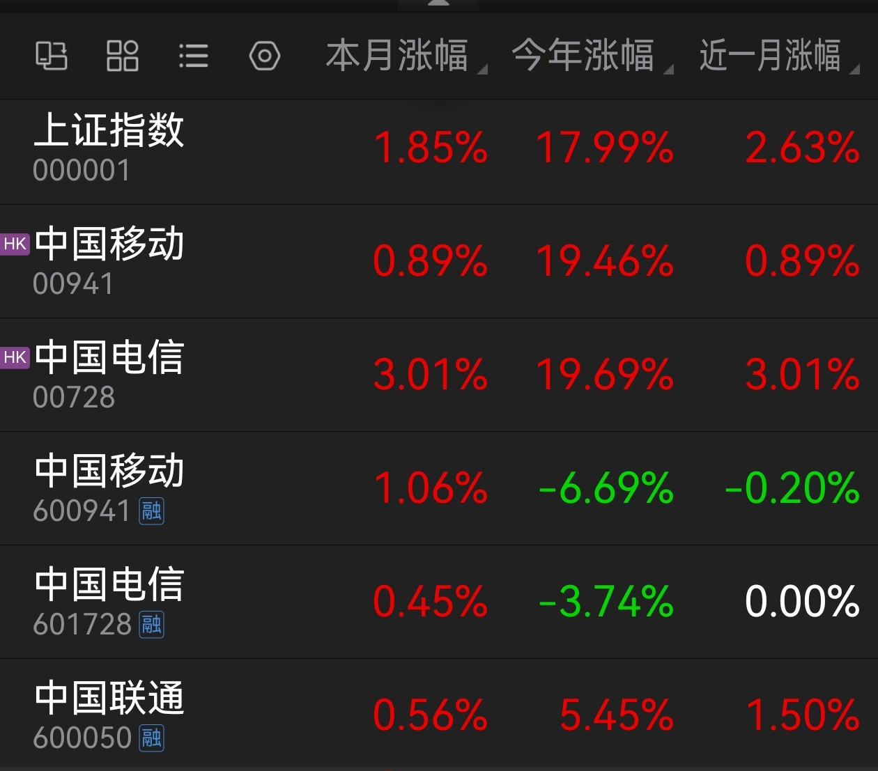 $中国联通(SH600050)$ 今天是10月份的最后一个交易日,我们来盘点一下10月份电信三大运营商的涨跌幅。