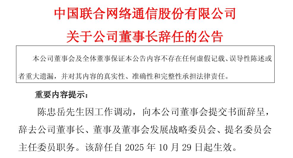 10月29日,中国联通公告,公司董事长陈忠岳因工作调动,申请辞去公司董事长、董事等职务,该辞任自2025年10月29日起生效。陈忠岳辞任后将不再担任公司任何职务。