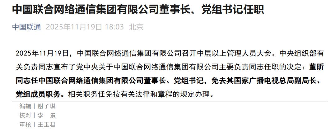 据中国联通公众号消息,2025年11月19日,中国联合网络通信集团有限公司召开中层以上管理人员大会。中央组织部有关负责同志宣布了党中央关于中国联合网络通信集团有限公司主要负责同志任职的决定:董昕同志任中国联合网络通信集团有限公司董事长、党组书记,免去其国家广播电视总局副局长、党组成员职务。相关职务任免按有关法律和章程的规定办理。