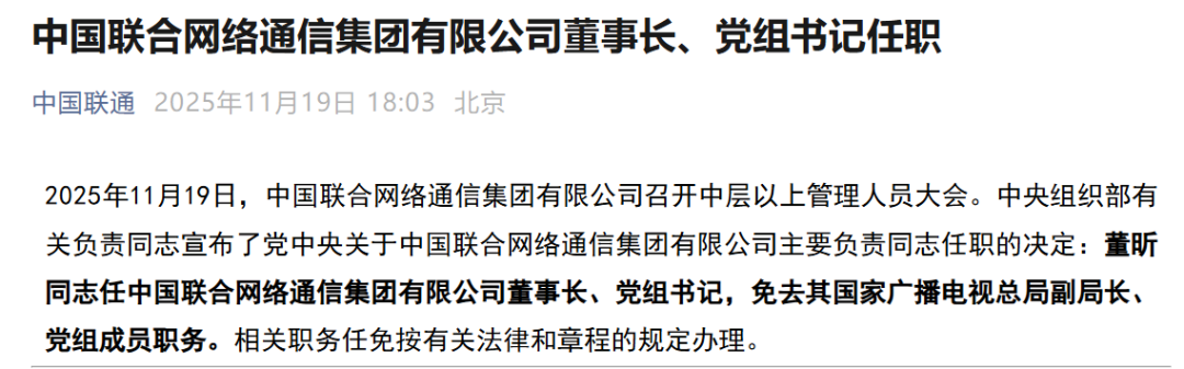 据中国联通官微消息,11月19日,中国联合网络通信集团有限公司召开中层以上管理人员大会。中央组织部有关负责同志宣布了党中央关于中国联合网络通信集团有限公司主要负责同志任职的决定:董昕同志任中国联合网络通信集团有限公司董事长、党组书记,免去其国家广播电视总局副局长、党组成员职务。相关职务任免按有关法律和章程的规定办理。