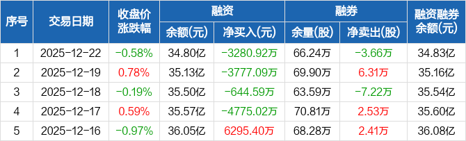 融资方面,当日融资买入6897.43万元,融资偿还1.02亿元,融资净偿还3280.92万元,连续4日净偿还累计1.25亿元。融券方面,融券卖出10.04万股,融券偿还13.7万股,融券余量66.24万股,融券余额340.47万元。融资融券余额合计34.83亿元。