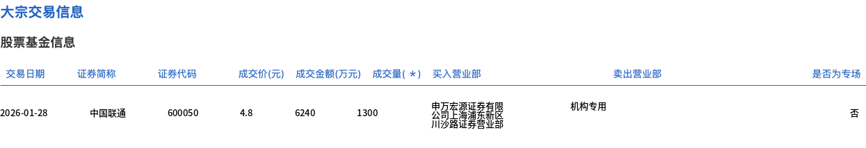 中国联通今日大宗交易折价成交1300万股,成交额6240万元