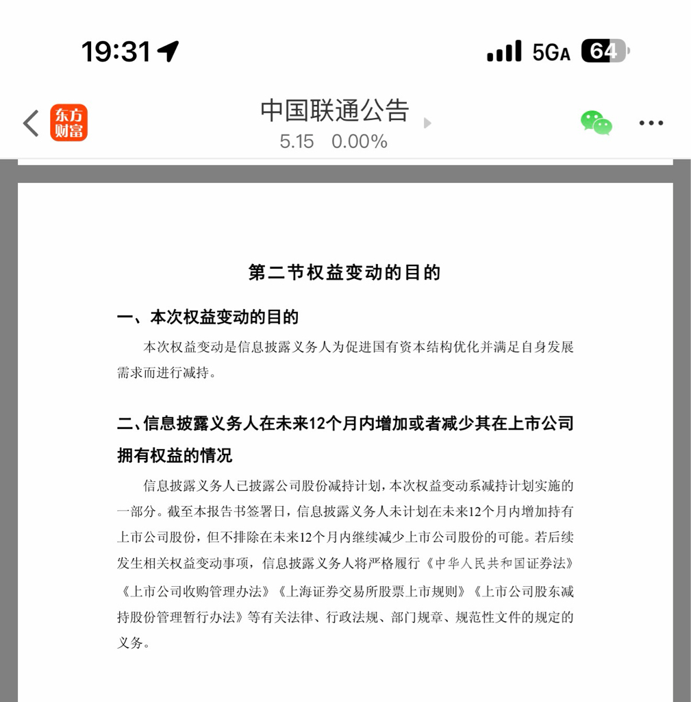 $中国联通(SH600050)$ 也就是说,除了这次要减持1%,剩下的5%,也可能减持是吧???