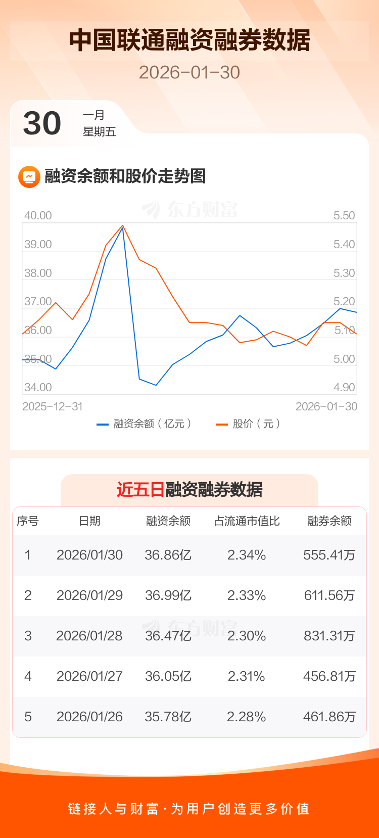 交易所最新数据显示,中国联通于2026年1月30日获融资买入1.65亿元,融资偿还1.78亿元,当日融资净偿还1300.61万元。目前,该股融资余额36.86亿,占流通市值比例为2.34%。