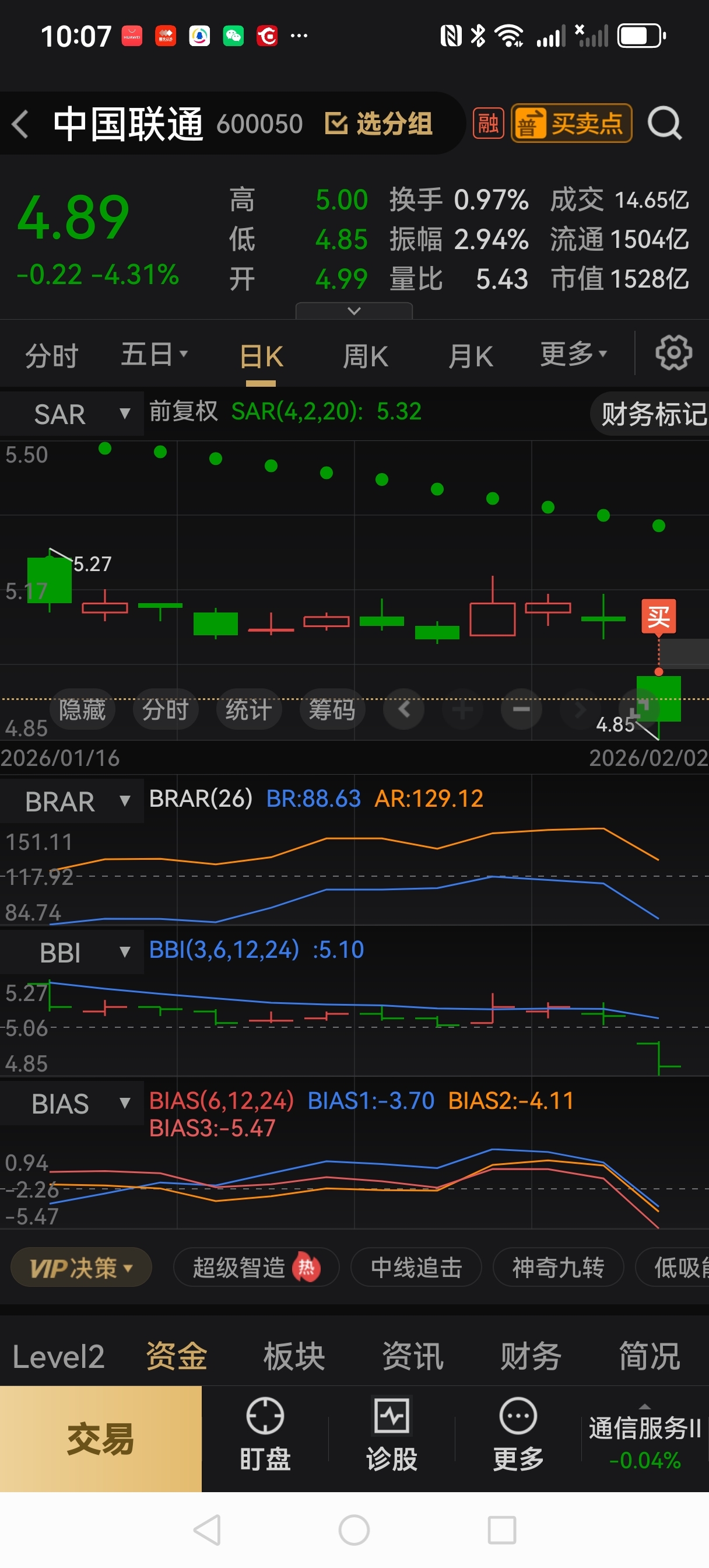 中国联通,2月2号,已建仓4.89,轻仓。