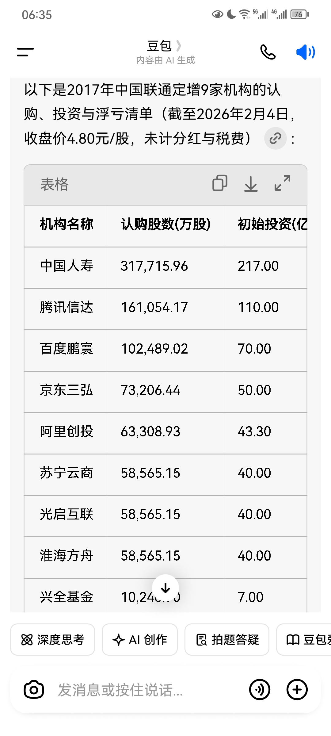 中国联通在2017年定向增发90.3亿股,定向增发价是6.83元,整体浮亏是20