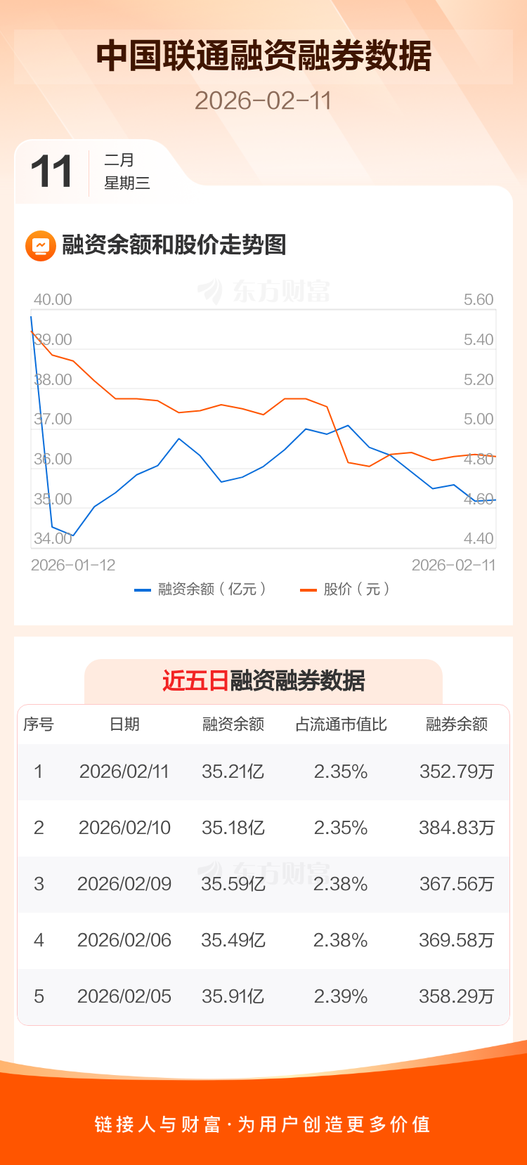 交易所最新数据显示,中国联通于2026年2月11日获融资买入8662.45万元,融资偿还8339.61万元,当日融资净买入322.84万元。目前,该股融资余额35.21亿,占流通市值比例为2.35%。