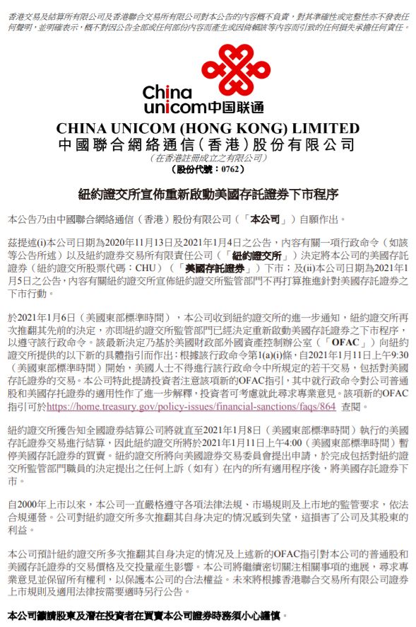 中国联通:对纽约证交所多次推翻其自身决定的情况感到失望