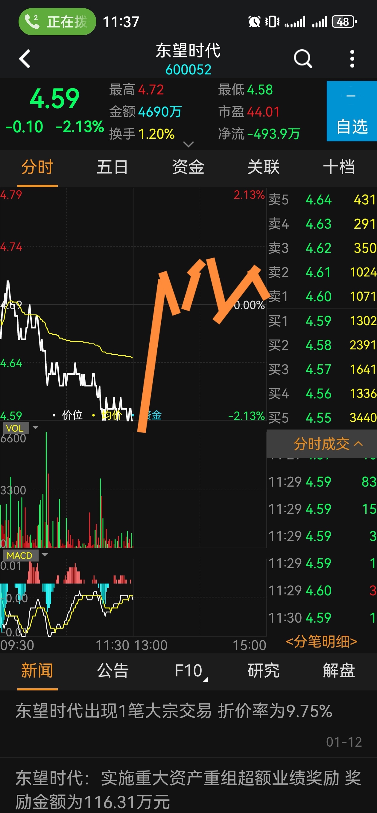 $东望时代(SH600052)$ 画饼时间到了,今天预计收变盘十字星,4.71左右