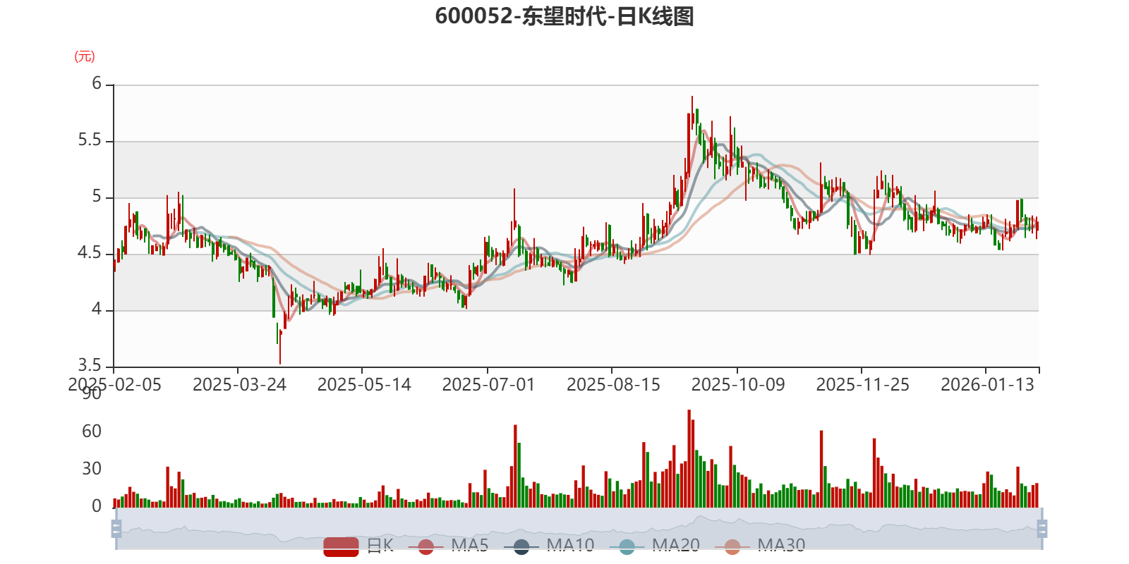 中证智能财讯东望时代(600052)1月30日晚间披露2025年度业绩预告,预计2025年归母净利润亏损4.5亿元,上年同期亏损3.67亿元;扣非净利润亏损3.7亿元,上年同期亏损2.04亿元。以1月30日收盘价计算,东望时代目前市盈率(TTM)约为-8.97倍,市净率(LF)约1.5倍,市销率(TTM)约5.98倍。