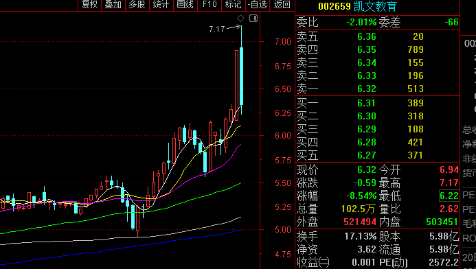 凯文教育首板由低位利空出尽+超跌反弹驱动,技术面完成“长阴后再度放量长阳”的V型反包,短线资金快速回流,今天反弹就走7.17的对数顶短期应该难突破,只考虑反弹。