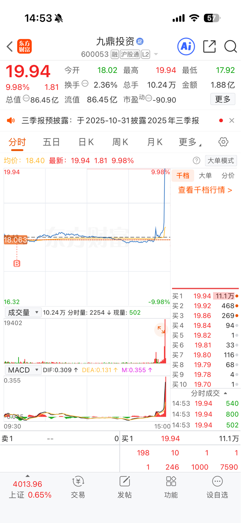 $九鼎投资(SH600053)$ 早盘瞄一眼,感觉有戏,盘中走的半死不活以为没戏,收盘zt,主力真会玩