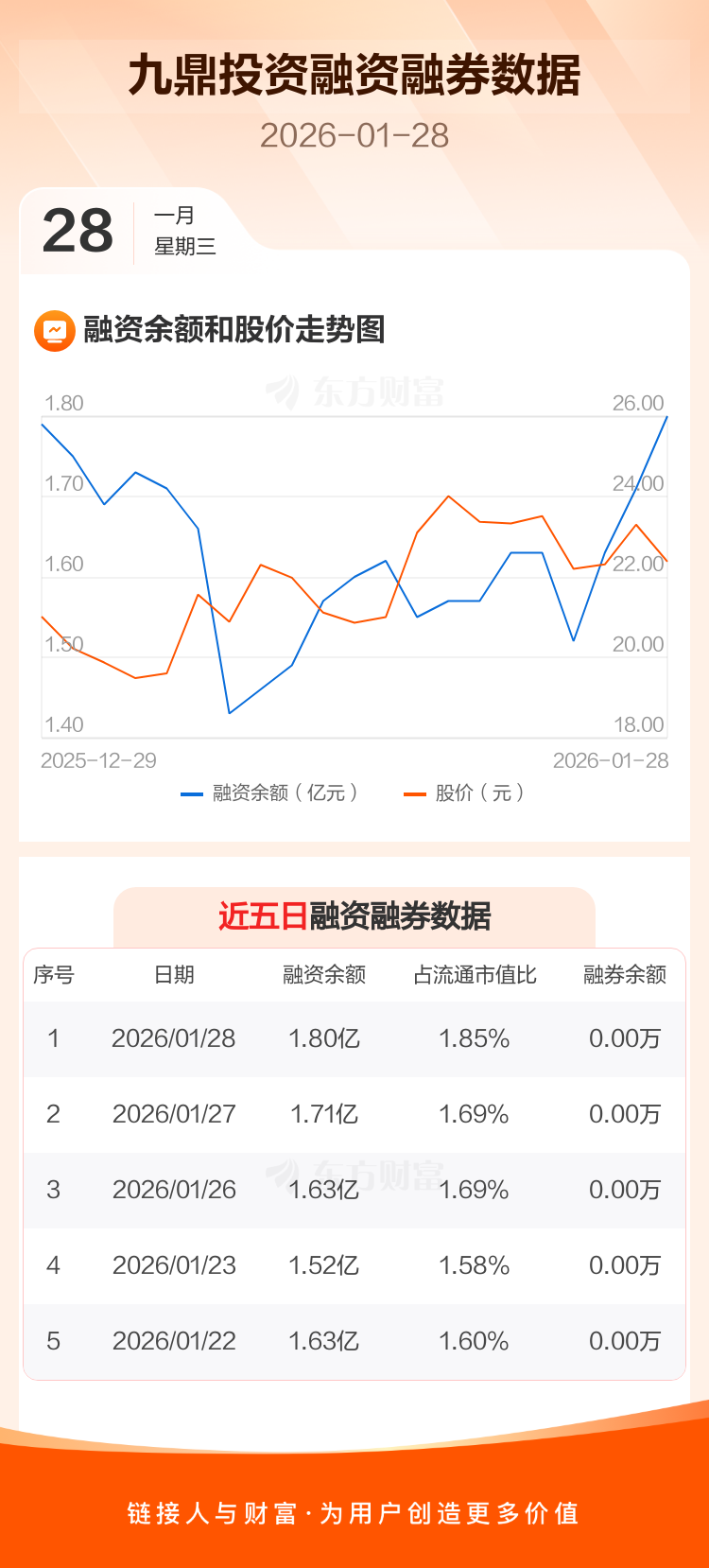 交易所最新数据显示,九鼎投资于2026年1月28日获融资买入2429.77万元,融资偿还1595.93万元,当日融资净买入833.85万元。目前,该股融资余额1.80亿,占流通市值比例为1.85%。