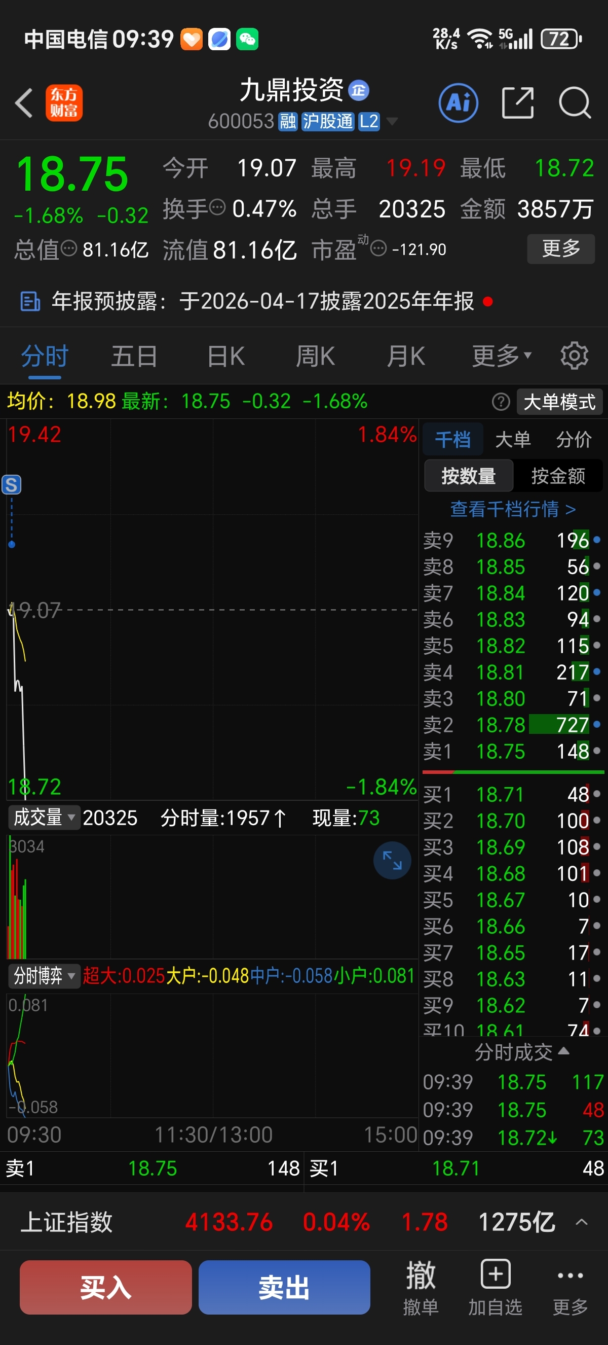 $九鼎投资(SH600053)$ 就知道这主力坏。早上坚决卖掉。