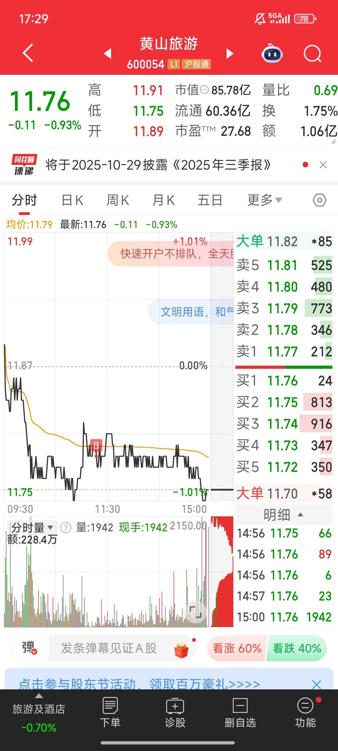 $黄山旅游(SH600054)$ 打个舱底,一万股