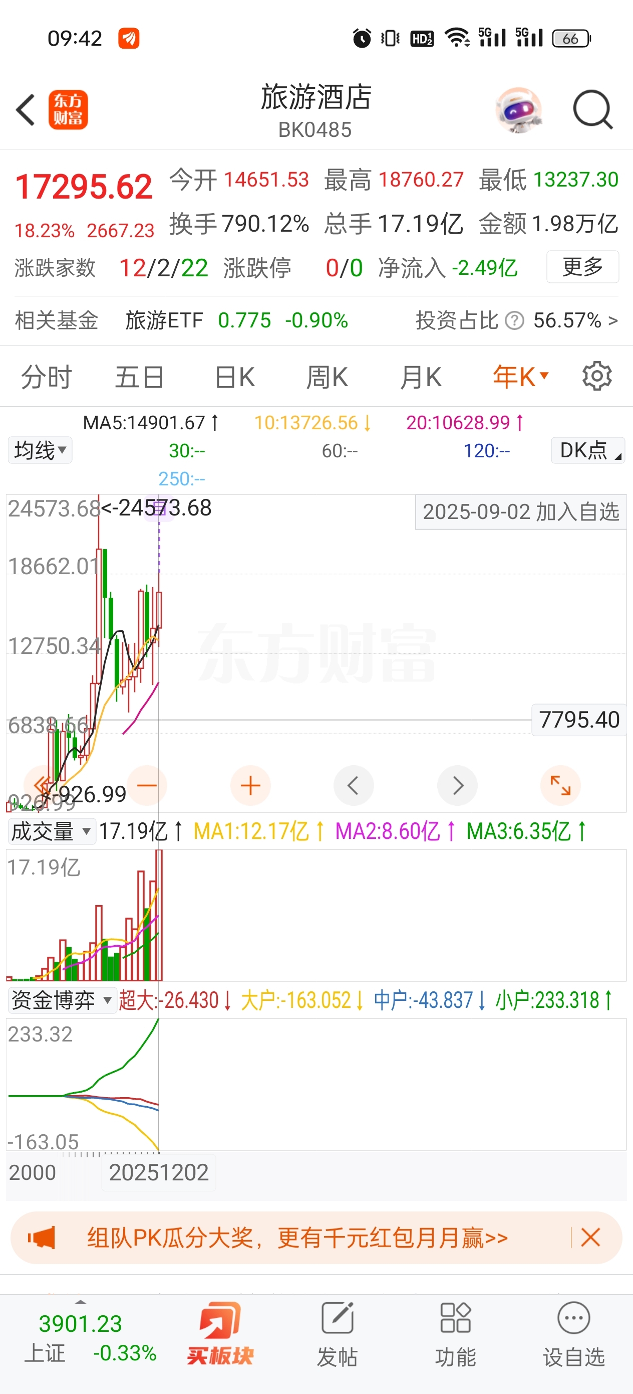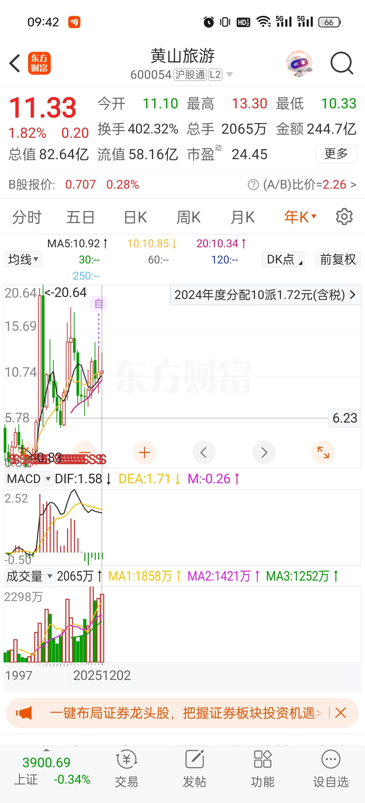 发两张图,一张是旅游板块的年线图,一张是黄山旅游年线图,跑输板块17个点,整整1