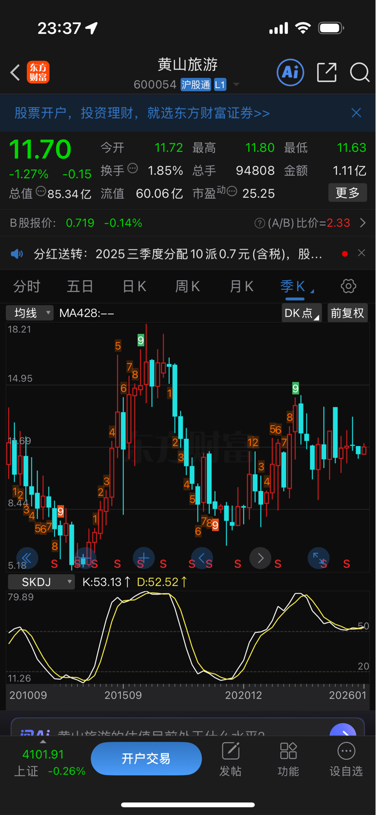 $黄山旅游(SH600054)$ 这种姜丝股还有人每天发帖,不是主流的杂毛,分红不够多,股价涨不动,市值区间管理的挺好的,上证4100点了,浪费时间浪费青春