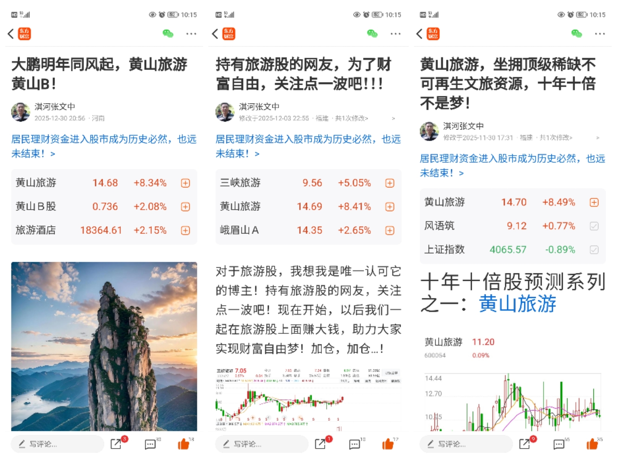 自从我连发三篇看好黄山旅游的帖子,黄山旅游就不断的上涨!旅游板块就逆势不断的上涨