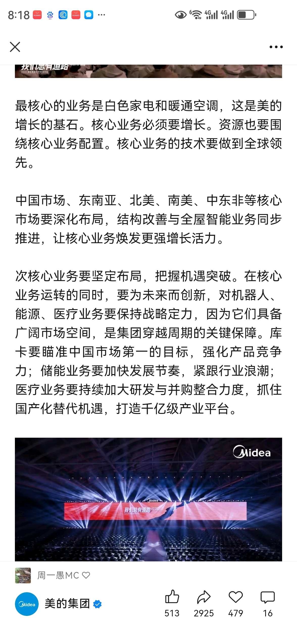 $万东医疗(SH600055)$ 1月16日,美的集团董事长兼总裁方洪波以《我们总有道路,前程崭新》为主题,向全球员工发表年度演讲。“医疗业务要持续加大研发与并购整合力度,抓住国产化替代机遇,打造千亿级产业平台。”========关于医疗业务的这三个核心表述,基本上就是全都聚焦指向于万东医疗身上了。
