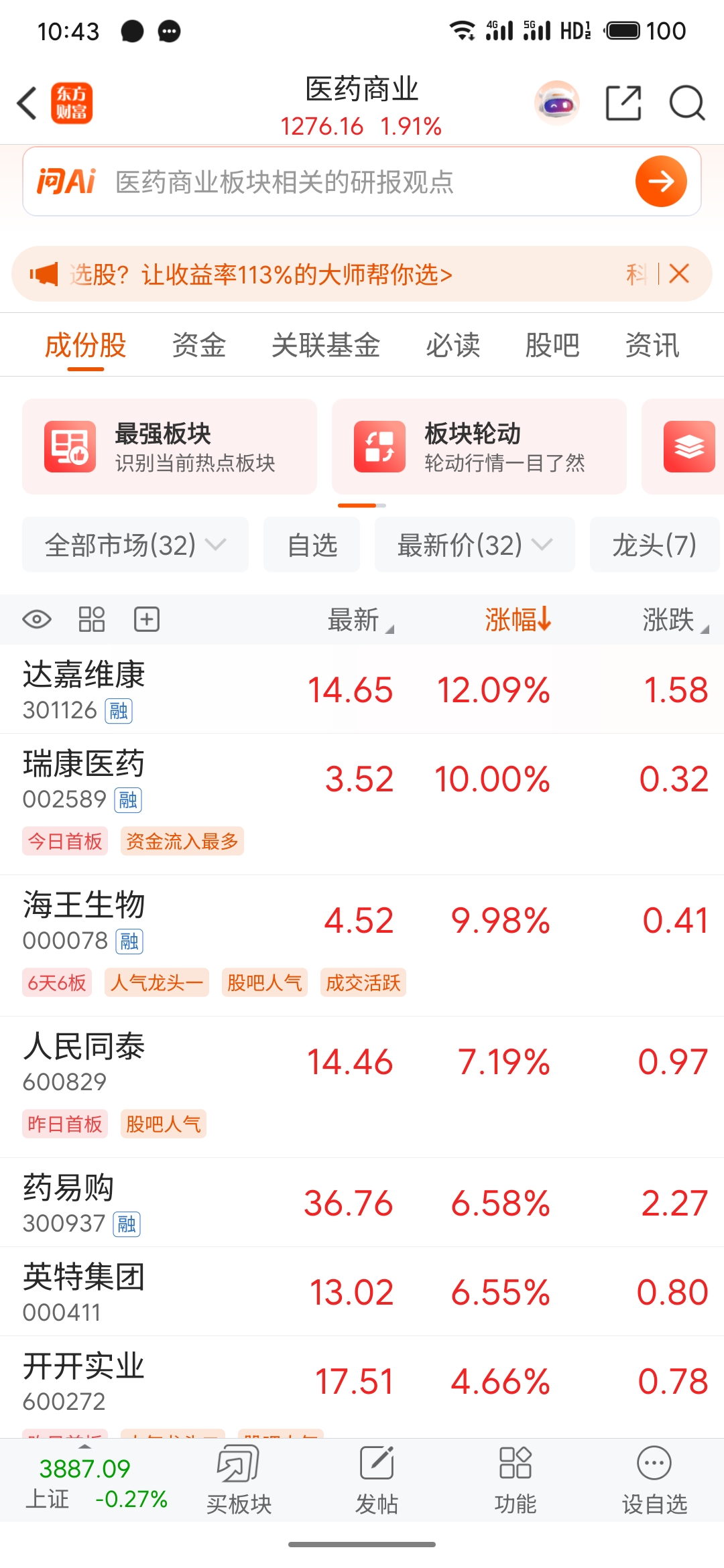 $中国医药(SH600056)$ 天天涨不过板块。跌时候比板块猛