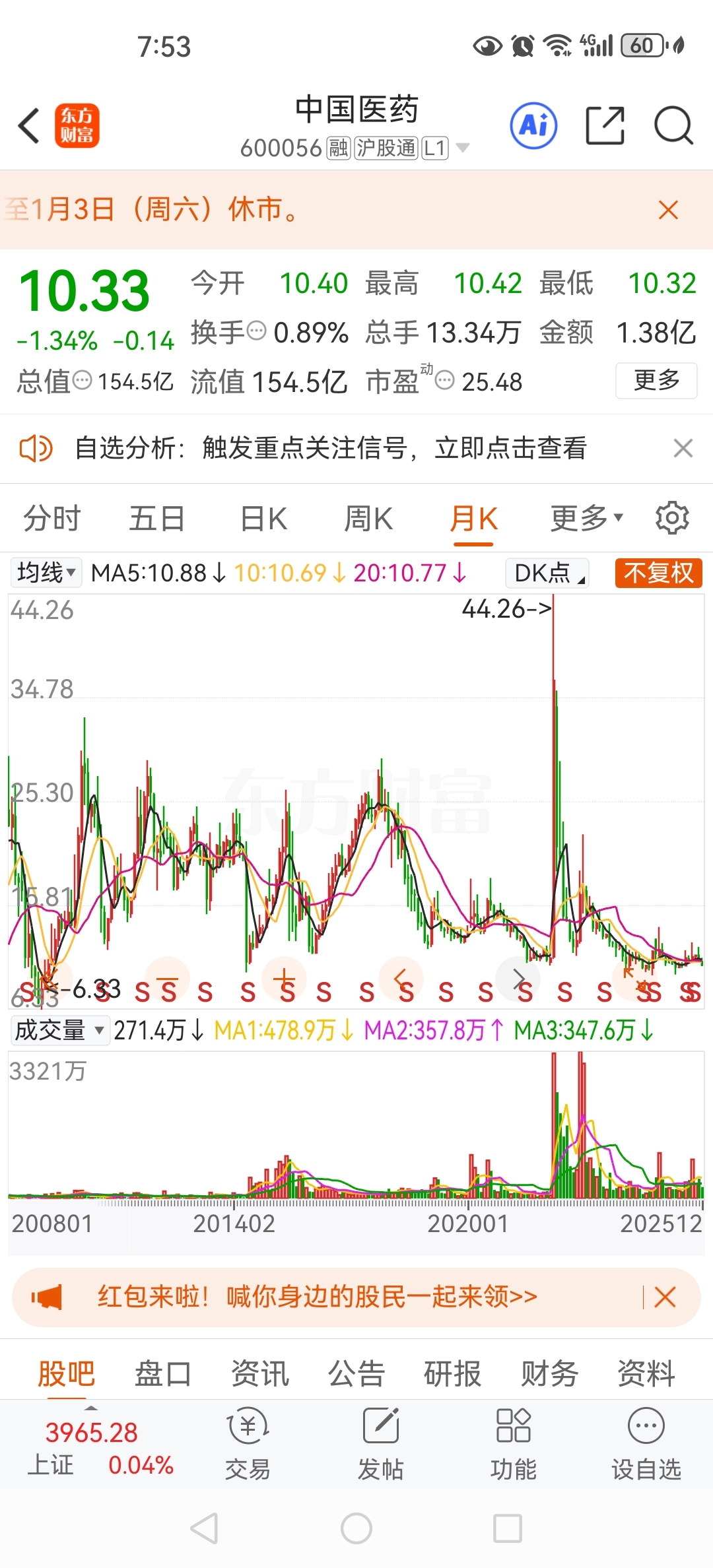$中国医药(SH600056)$ 看它以前的走势,价格一直15元波动,市值2百亿。
