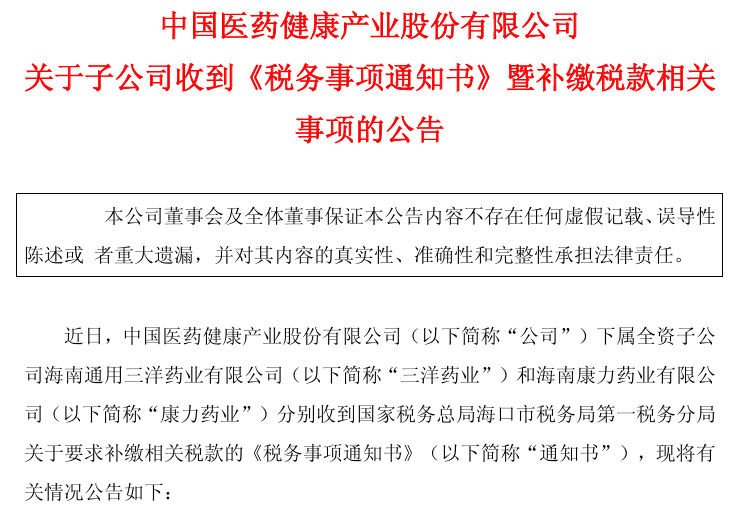 两子公司被要求补税,中国医药本年净利预计受影响超6500万元