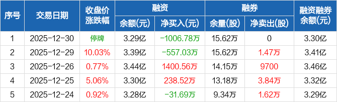 五矿发展:融资净偿还1006.78万元,融资余额3.29亿元(12-30)