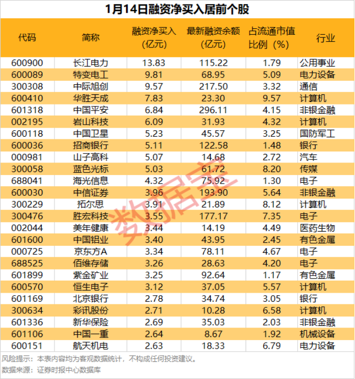 具体到个股,1月14日获融资净买入1亿元以上的有87只,其中,10只股融资净买入额超5亿元。长江电力融资净买入额居首,当日净买入13.83亿元;其次是特变电工、中际旭创,融资净买入金额分别为9.81亿元、9.57亿元;融资净买入金额居前的还有华胜天成、中国平安、岩山科技等。