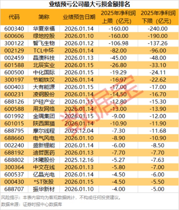 预亏公司中,有46家公布了具体的亏损金额区间,以预计最大亏损金额统计,16股亏损金额超过10亿元。亏损金额最多的是华夏幸福,公司预计2025年亏损160亿元~240亿元。亏损金额较大的还有绿地控股、智飞生物等,绿地控股预计亏损160亿元~190亿元;智飞生物预计亏损106.98亿元~137.26亿元。