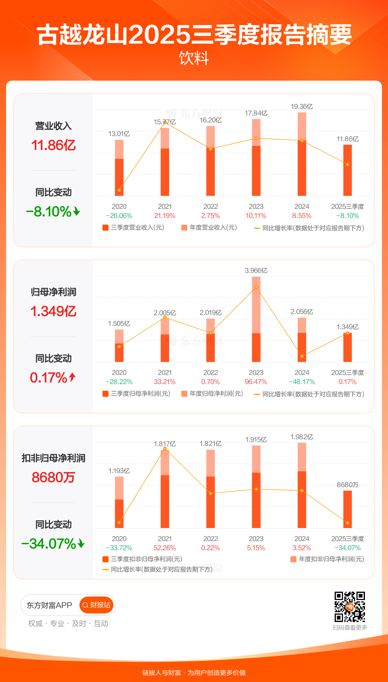 古越龙山10月29日发布2025年三季报显示,公司前三季实现营业收入11.86亿元,同比下滑8.10%;归母净利润1.35亿元,同比增长0.17%;扣非归母净利润8680.31万元,同比下滑34.07%。