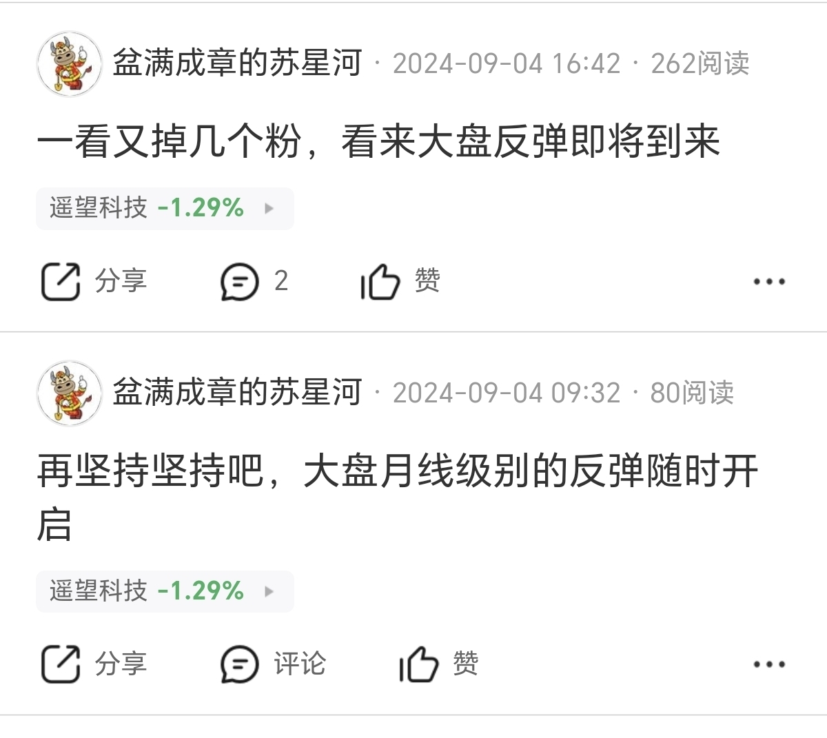 $古越龙山(SH600059)$ 这就是我在遥望吧发的最后几篇帖子,自己看日期,底层逻辑根本就不在一个层面,还散户越多越好,茅台的二十多万粉丝怎么支撑一两万亿的市值的,工商银行为什么长期几倍市盈率,自己想想深层次的原因,别把自己局限在一个小房子里