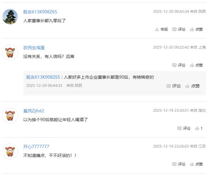 在古越龙山,就有投资者质疑“以为换个90后就能让年轻人喝酒了”,还有投资者表示“不知道痛点,干不好活的!”,也有不少投资者称“董事长是90后才算年轻”等。