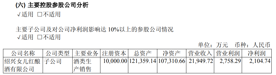 公开资料显示,女儿红公司系上市黄酒企业浙江古越龙山绍兴酒股份有限公司(600059.SH,以下简称古越龙山)全资子公司,在财报中,系唯一对公司净利润影响达10%以上的子公司。