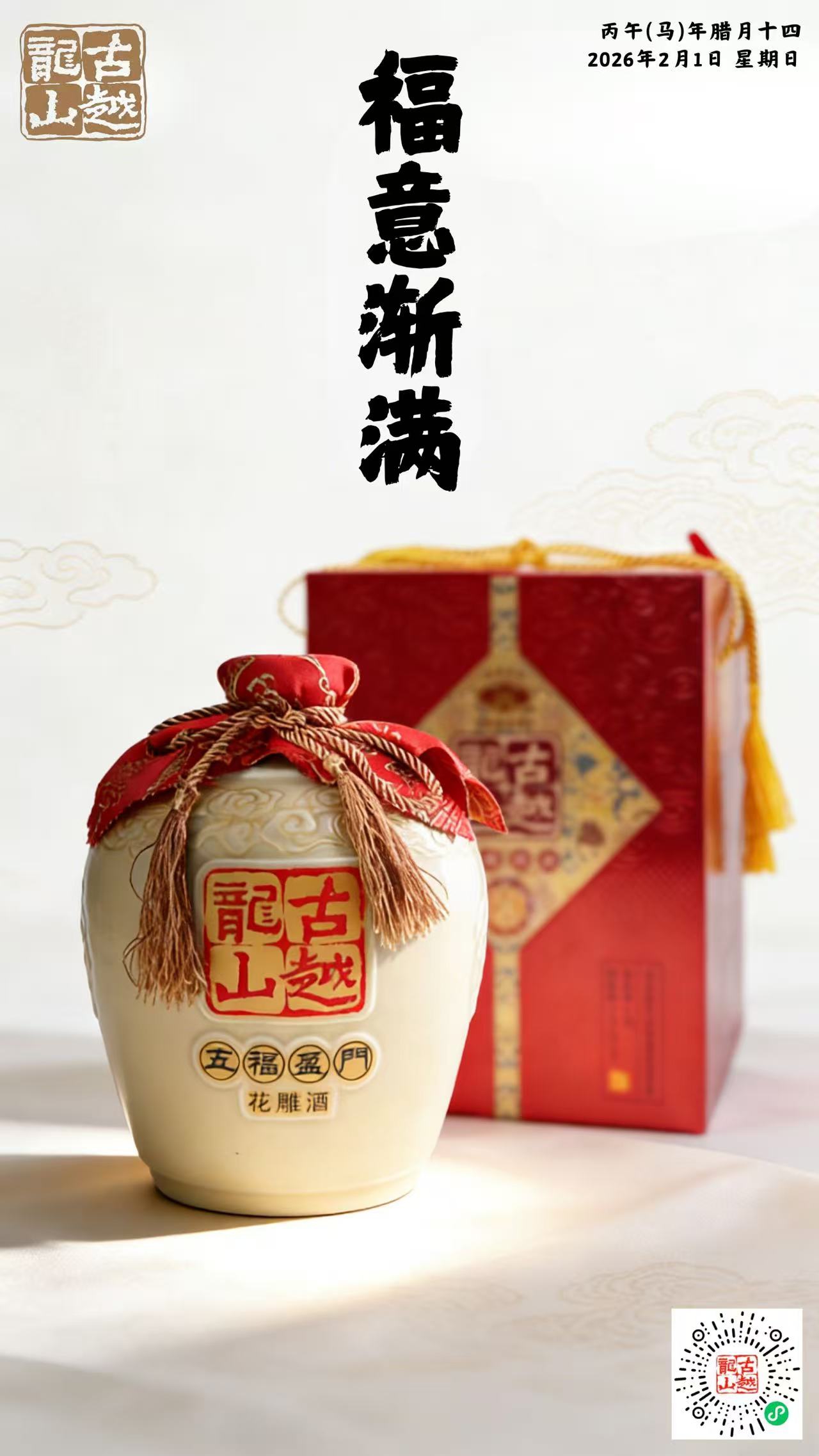 腊味正浓,古越龙山福酒已温。封藏岁月醇香,开启马年福运。一杯古越龙山花雕酒,满堂欢喜;五福盈门,岁岁安康。