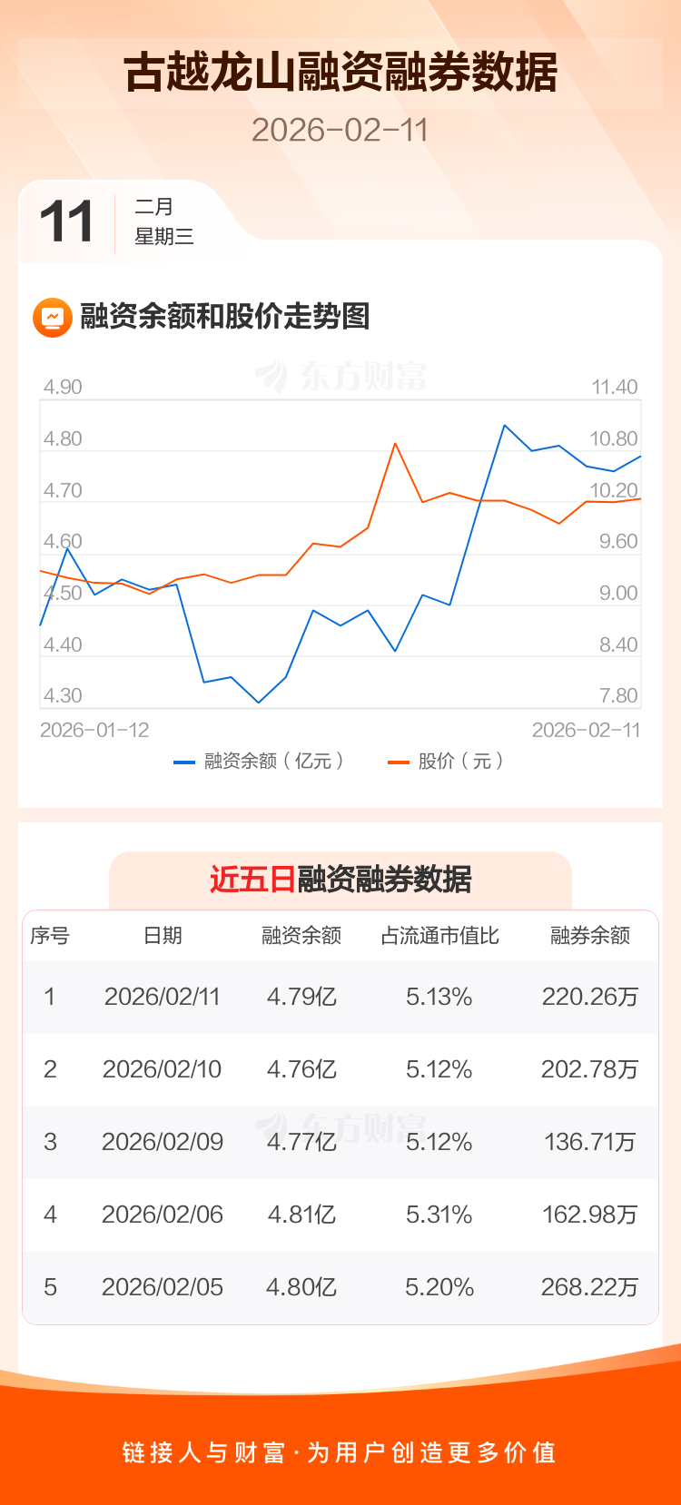 交易所最新数据显示,古越龙山于2026年2月11日获融资买入2832.48万元,融资偿还2609.70万元,当日融资净买入222.77万元。目前,该股融资余额4.79亿,占流通市值比例为5.13%。
