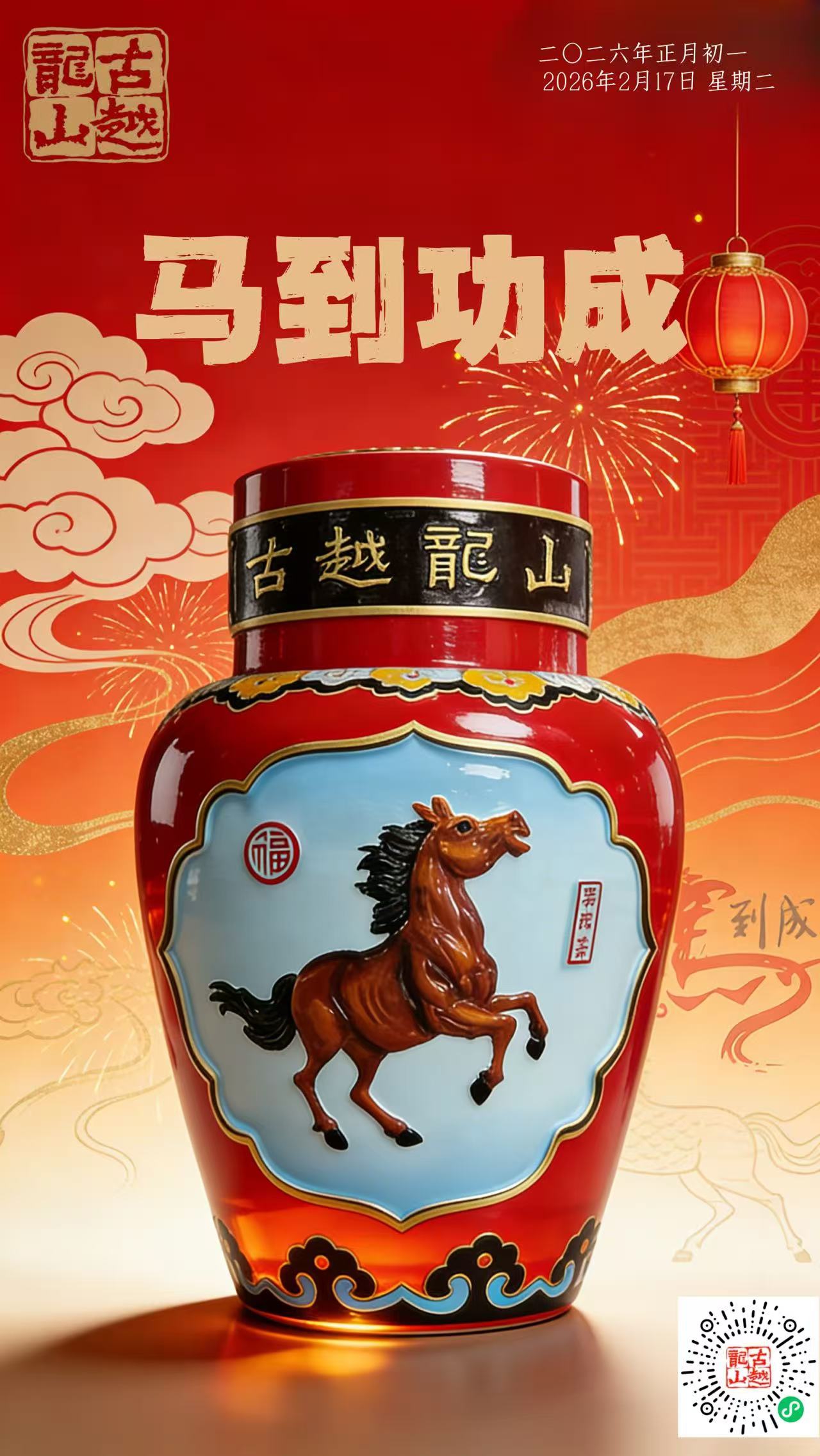 正月初一,酒香贺岁。千年越酿的醇厚,遇上丙午马年的昂扬,红坛之上,骏马腾骧。饮一
